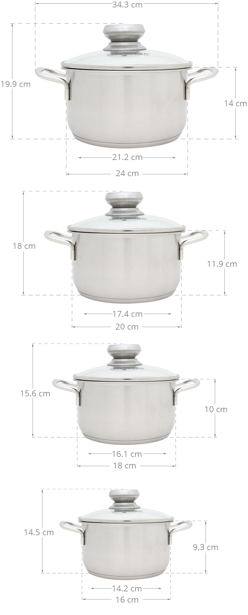 Bộ nồi gồm có 4 nồi: nồi nhỏ 16 cm kho, om, 2 nồi trung 18 cm và 20 cm nấu canh, nồi lớn 24 cm luộc gà nguyên con khoảng 1.5 kg.