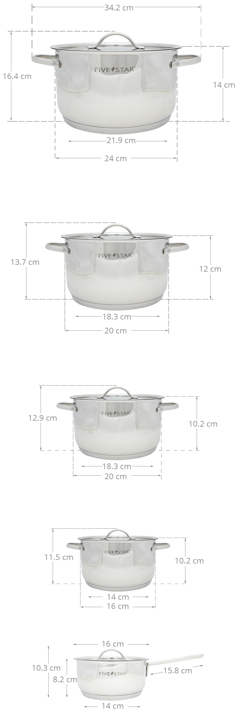 Thiết kế sang trọng Bộ 5 nồi quánh inox cao cấp Kit Fivestar FS10C thiết kế đẹp mắt, hiện đại, thương hiệu Fivestar – Việt Nam, sản xuất tại Việt Nam. Bộ nồi gồm 5 sản phẩm: Quánh nhỏ 16 cm có thể dùng nấu cháo cho bé, nồi 16 cm dùng kho thịt khoảng 0.5 kg, 2 nồi 20 cm dùng nấu canh, làm súp, nồi lớn 24 cm dùng nấu lẩu, luộc gà khoảng 1.5 kg.