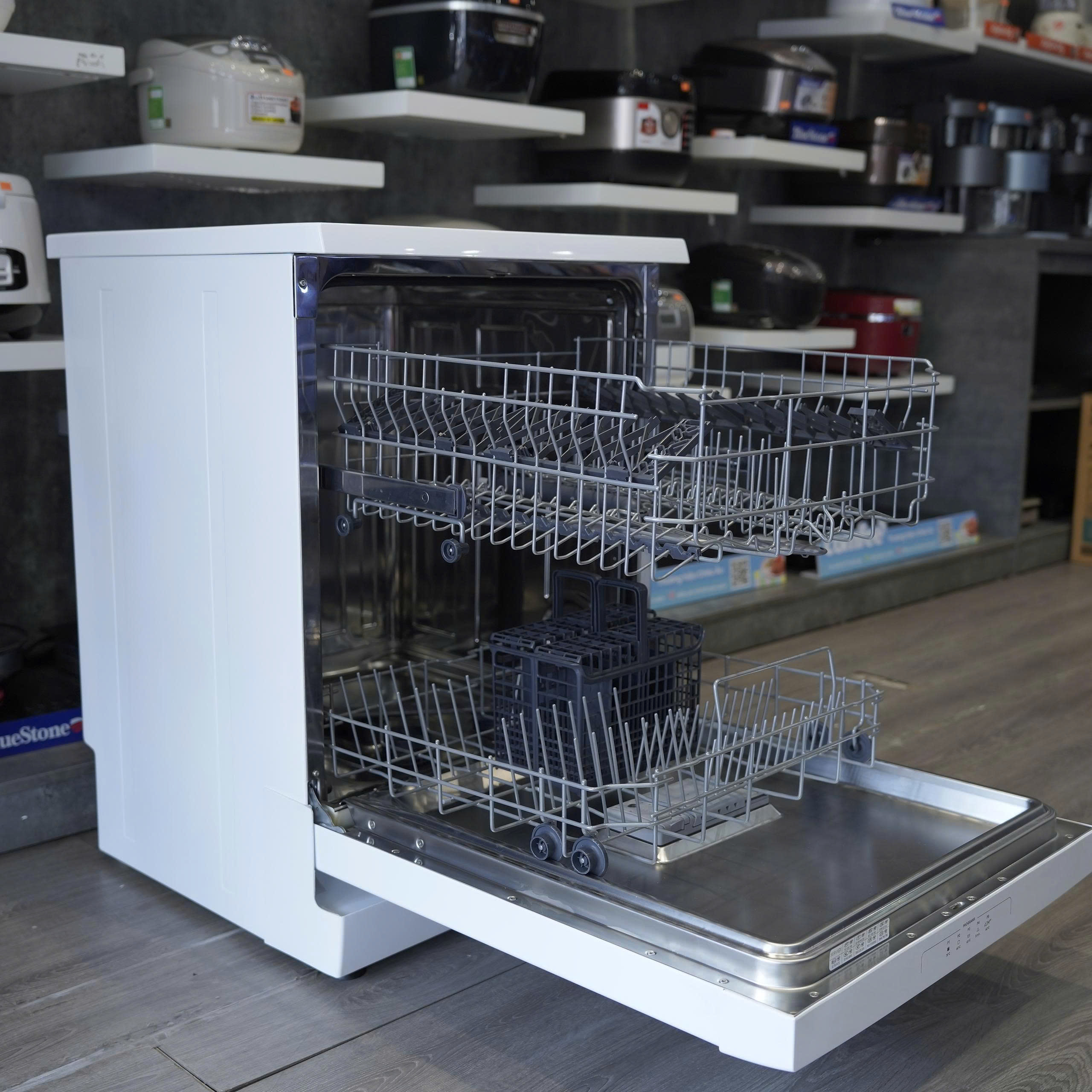 - Máy rửa chén Candy trang bị 2 khay chén trên dưới cùng 1 giỏ đựng dao, muỗng đĩa.
